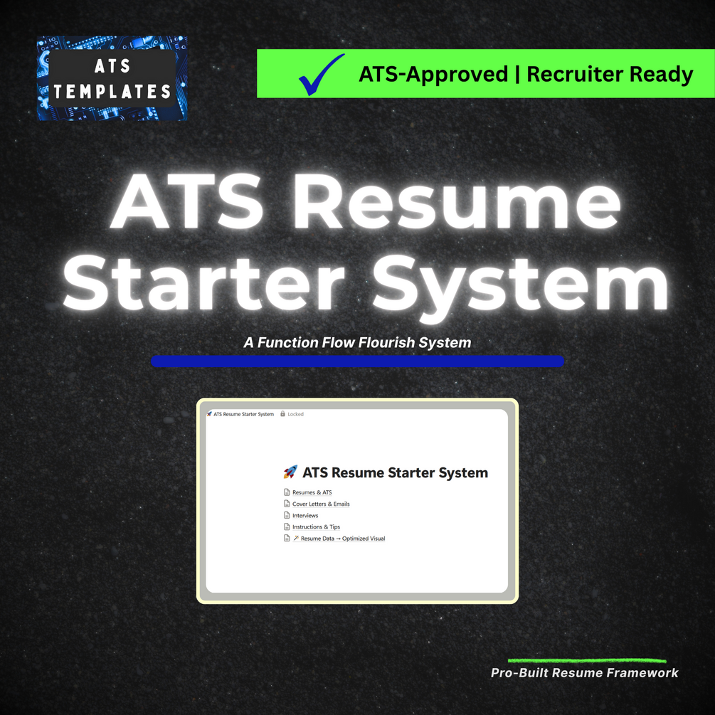 Everything you need to pass the system — and stand out beyond it. The ATS Starter Kit delivers 30+ proven templates for resumes, cover letters, and interviews, all designed to clear ATS filters and capture recruiter attention. Includes a built-in text-to-visual converter and complete best-practice guide to help you present a professional, powerful application — fast.